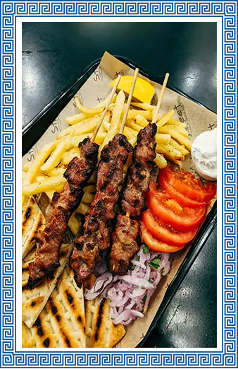 Välj mellan (Kyckling elller Fläsk). Serveras med friterad skivad potatis,tomatsås & tzatziki